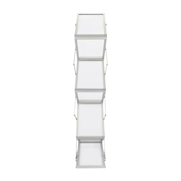 Porta Catálogos Doble con estructura de aluminio y acrílico, incluye impresión. Montaje rápido y almacenamiento compacto en maleta. Expositor de doble cara ideal para espacios interiores. Medida A4: 22 x 28 cm.